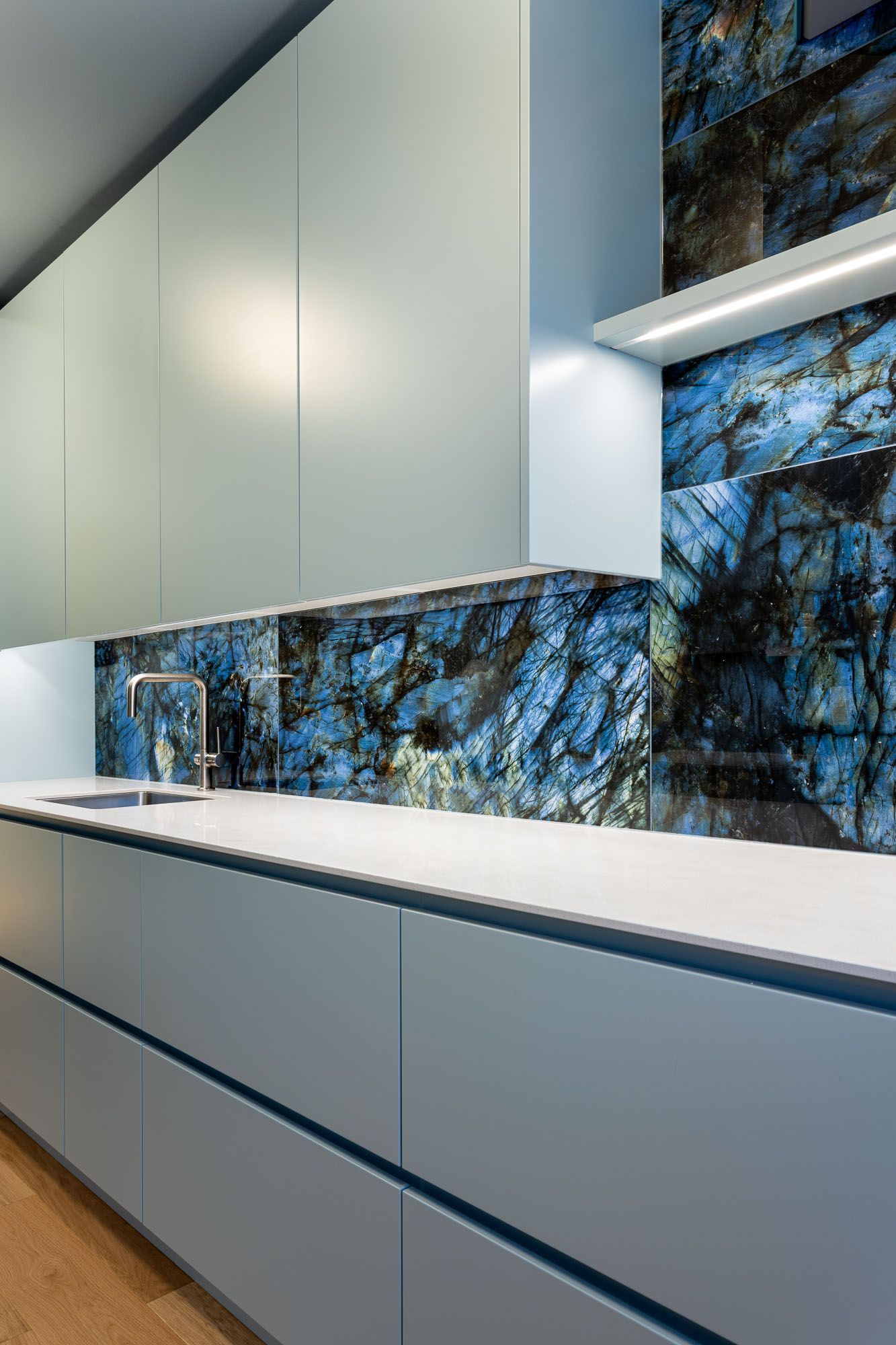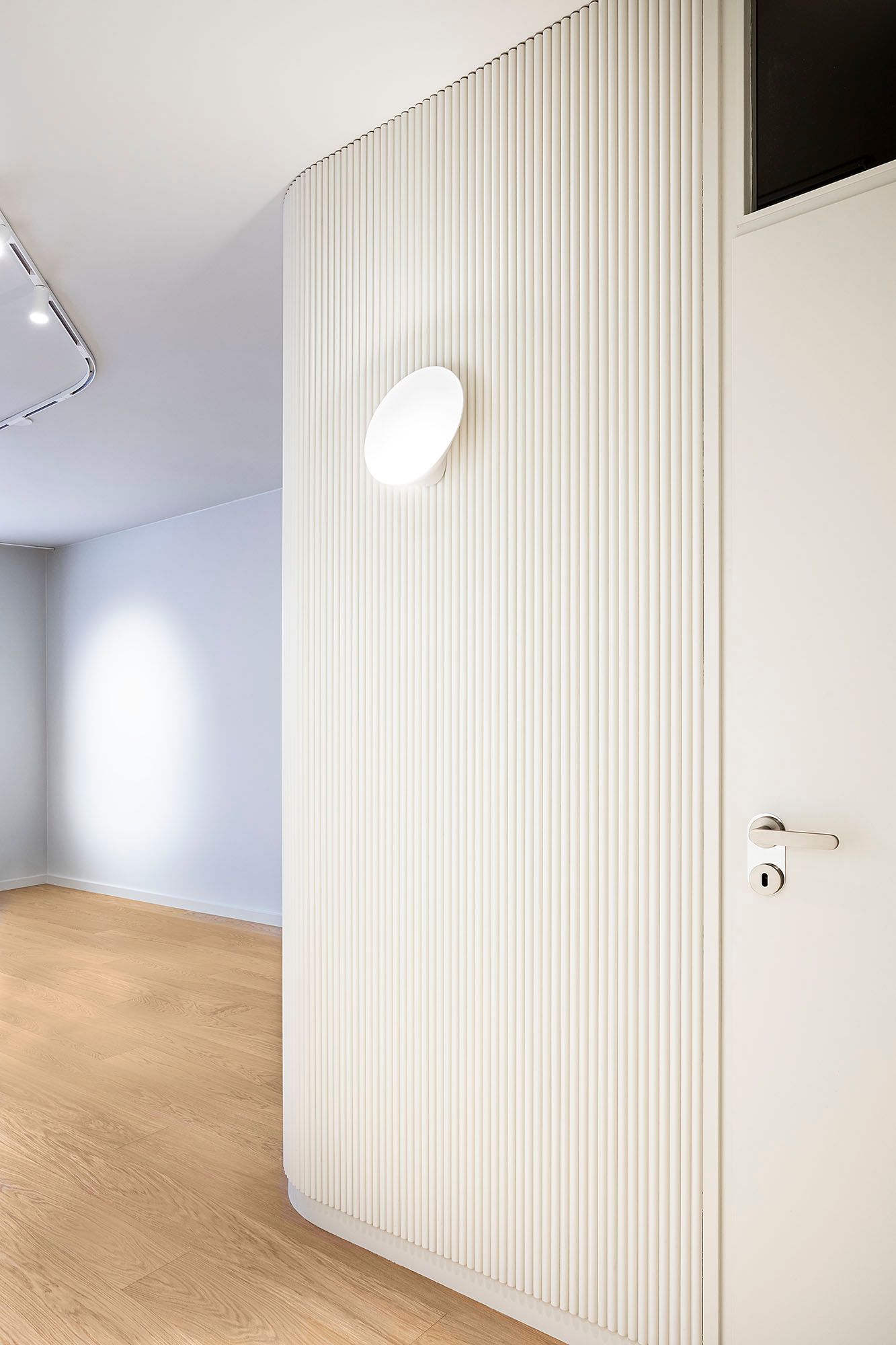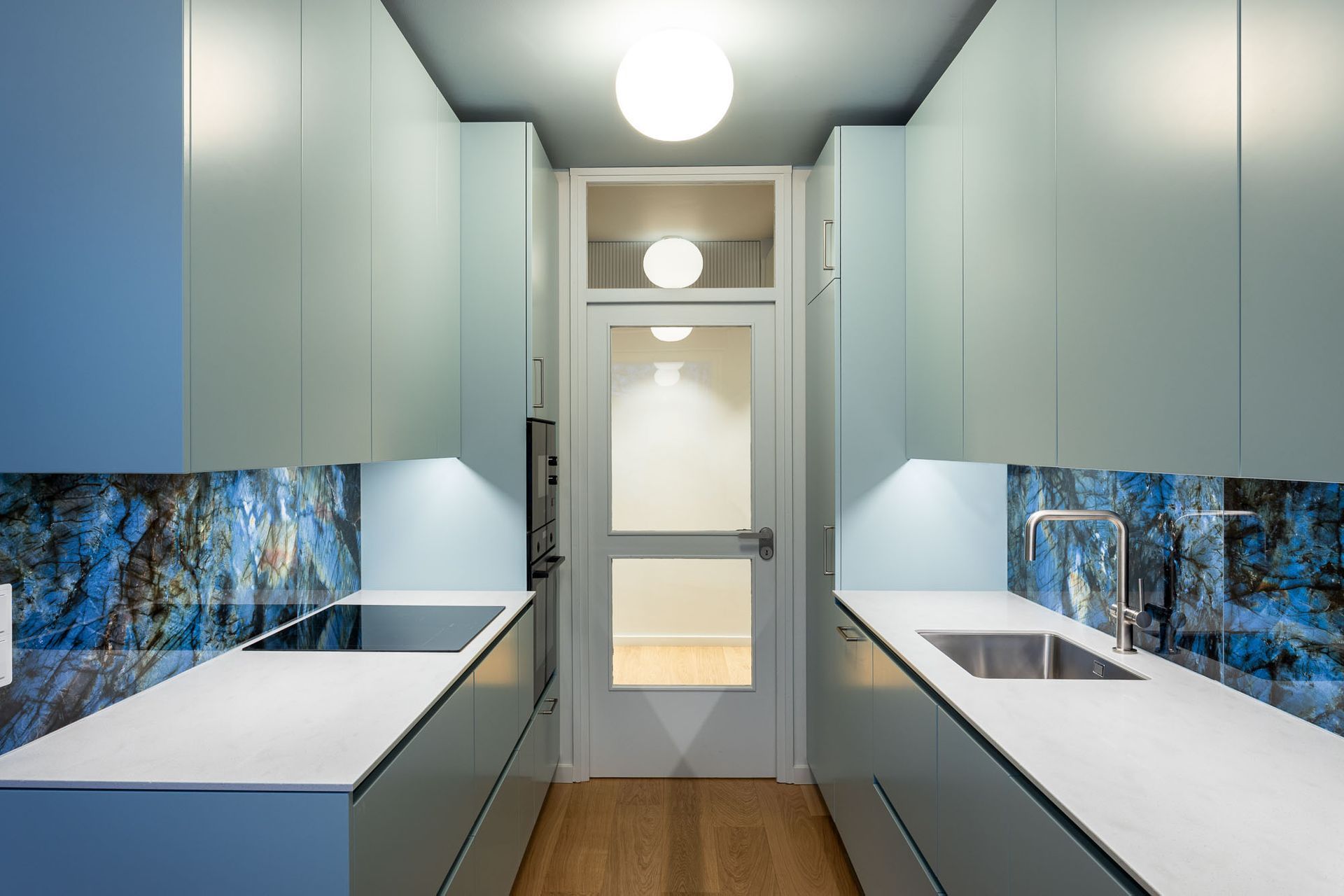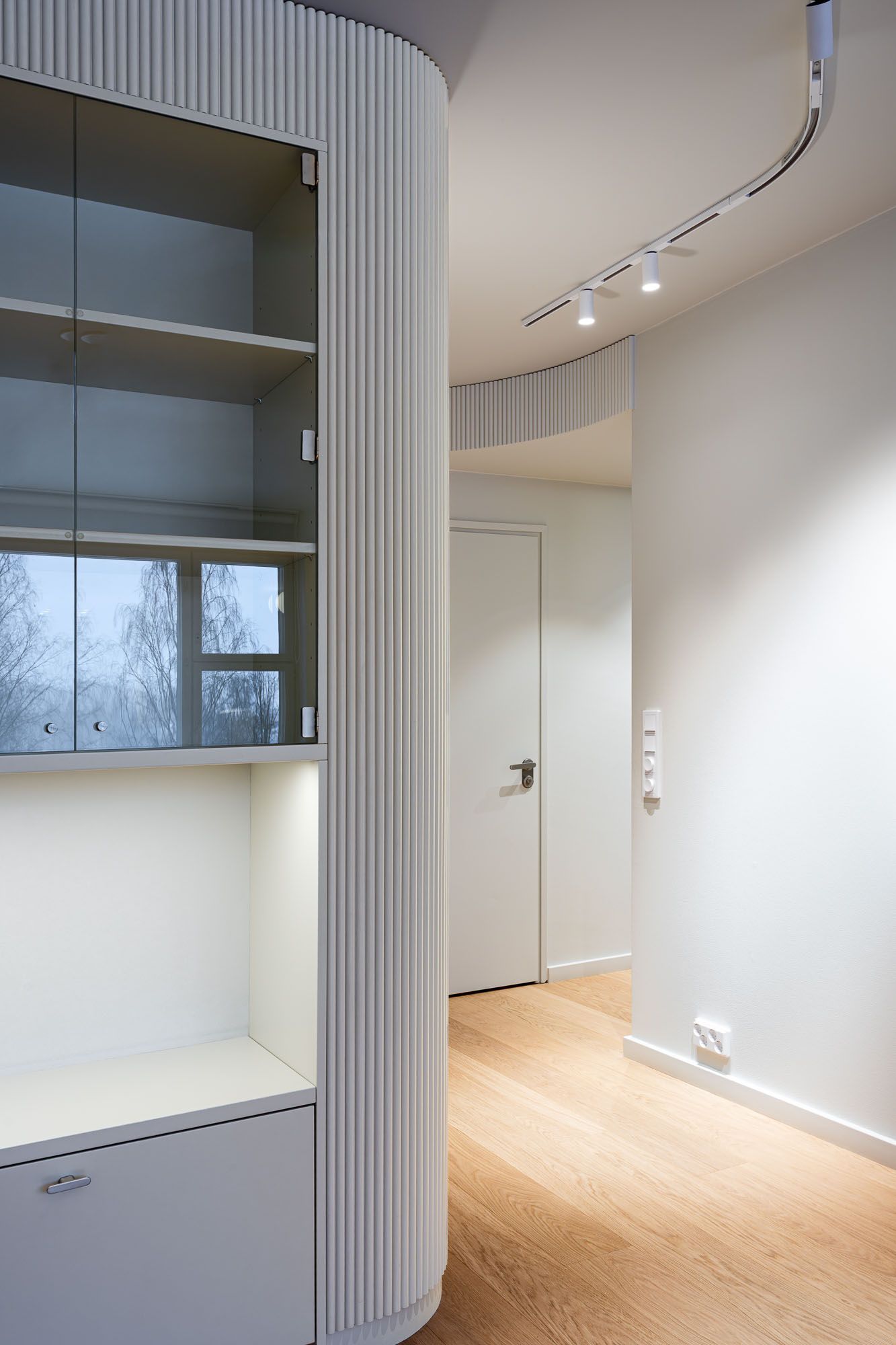 80-luvulla rakennetun kerrostalon kaksion (50 m2) remontti suunniteltiin päivittämällä huoneistossa kaikkien huoneiden pinnat, valaistus ja kiintokalusteet. Suunnittelussa lisättiin säilytystiloja ja keittiön käytettävyyttä parannettiin lisäämällä kaappitilaa ja otettiin huomioon asiakkaan leivontaharrastus huomioon. Huoneisto on yksityiskäytössä kahdella aikuisella.